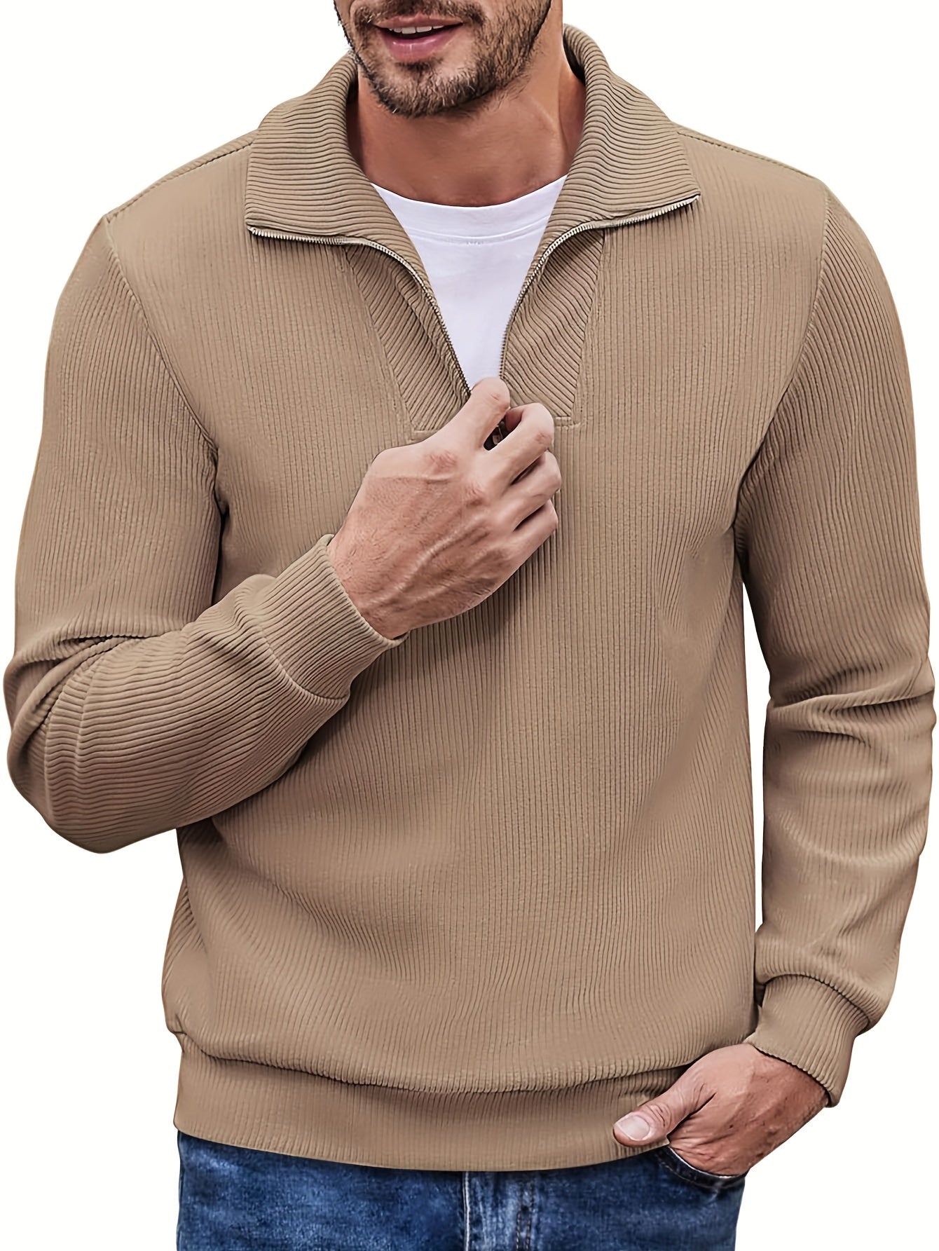 Camiseta de manga larga con solapa y cremallera de color liso para hombre para todas las estaciones, camisetas casuales de mezcla de algodón ajustadas y modernas como regalo